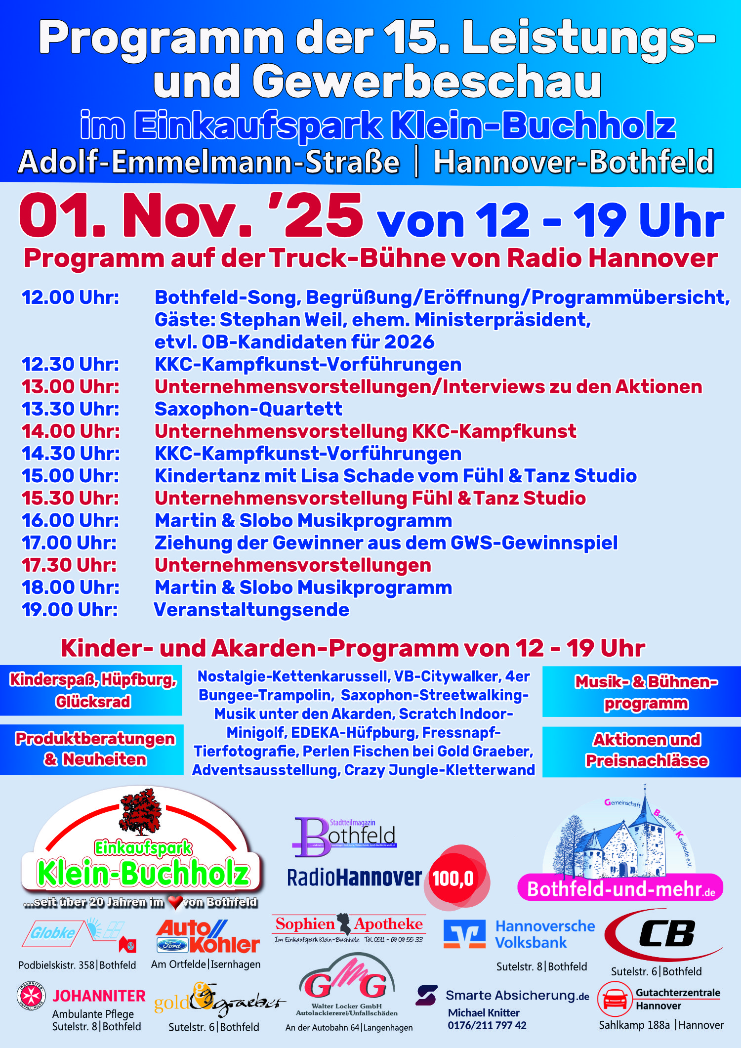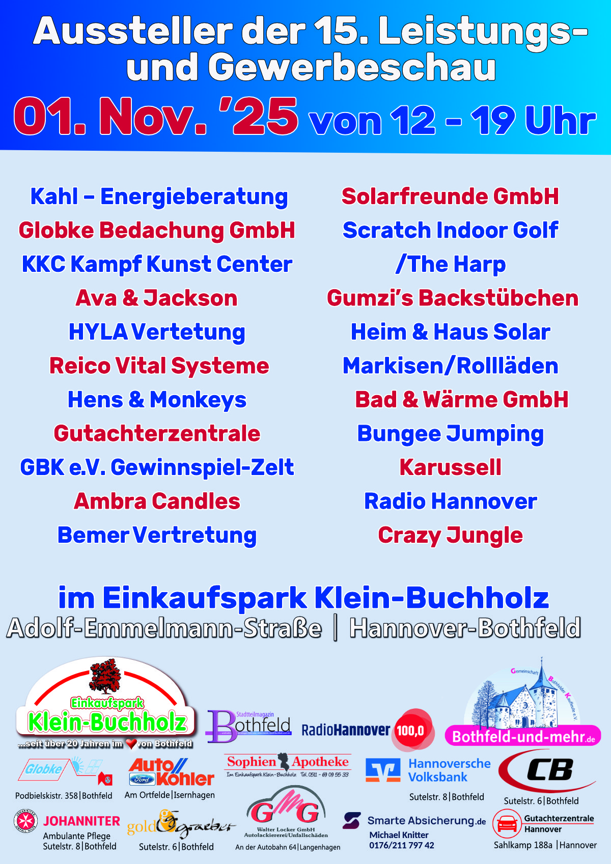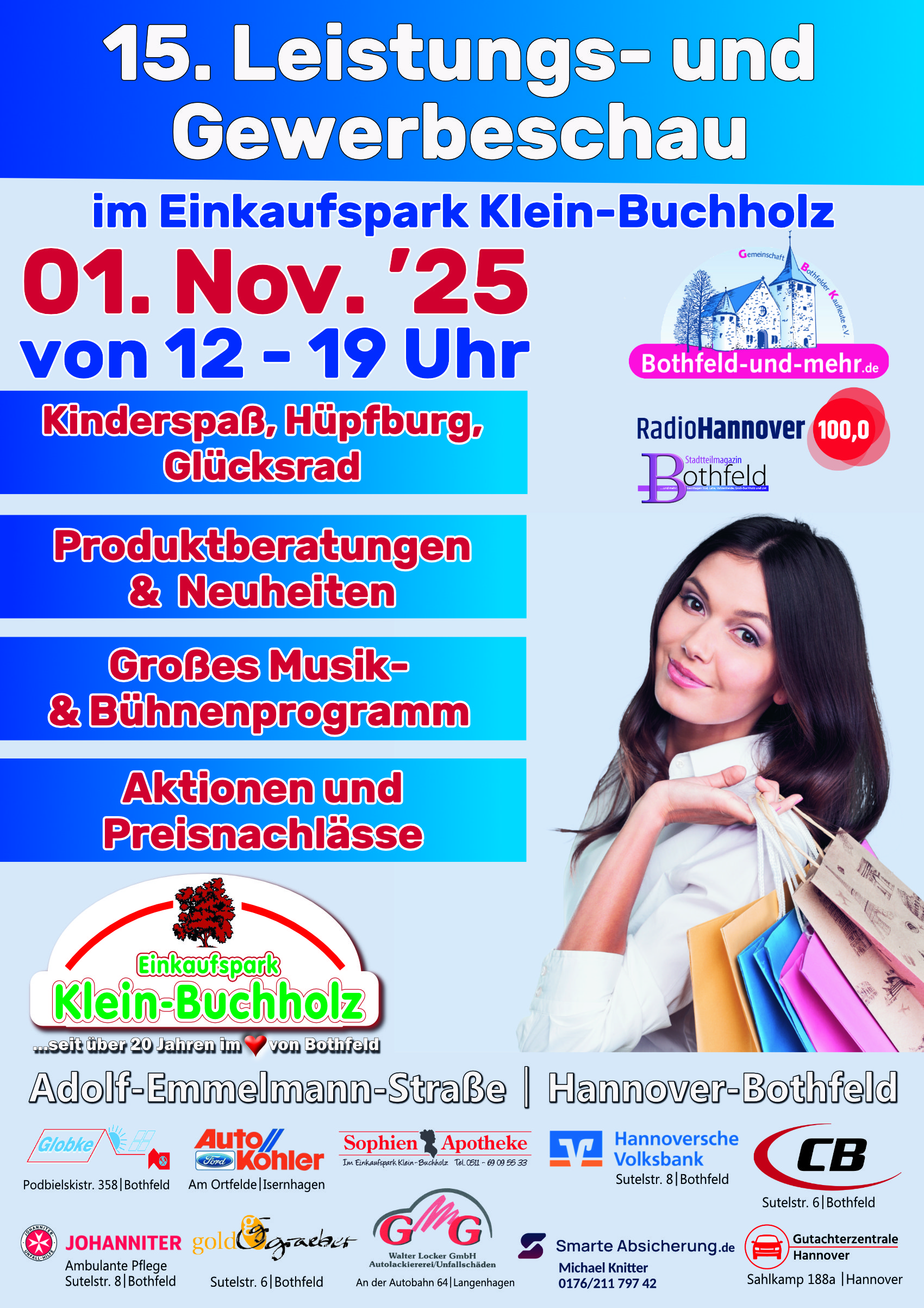 Nach dem Herbstmarkt geht es direkt weiter mit der Gewerbe- & Leistungschau am 01. November 2025 in der Zeit von 12 – 19 Uhr auf dem Gelände des Einkaufspark Klein-Buchholz an der Sutelstraße/Adolf-Emmelmann-Straße.