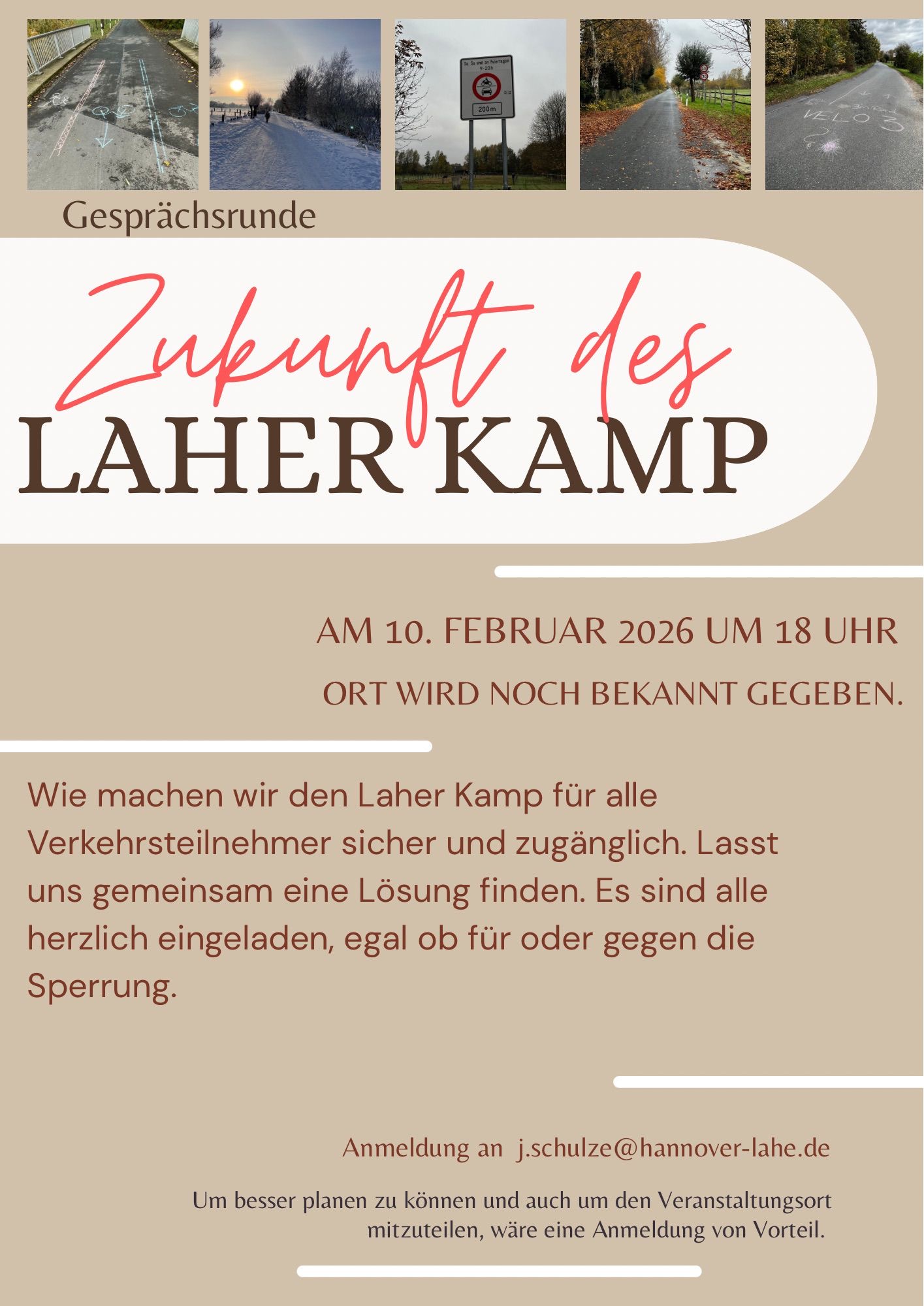 Die Anwohner, Betroffene, Befürworter und Gegner der geplanten Sperrung des Laher Kamp sind herzlich zu einer Gesprächsrunde am 10.02.2026 um 18 Uhr eingeladen. Kernthema zur Findung einer gemeinsamen Lösung ist dazu: „Wie machen wir den Laher Kamp für alle Verkehrsteilnehmer sicher und zugänglich“.